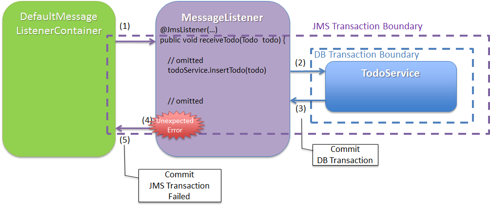 JMSとDBのトランザクションの連携にはJTAによるグローバルトランザクションを使用する方法があるが、アプリケーションサーバーがグローバルトランザクションを提供していない場合は”Best Effort 1 Phase Commit”の使用を検討する。詳細は以下を参照されたい。