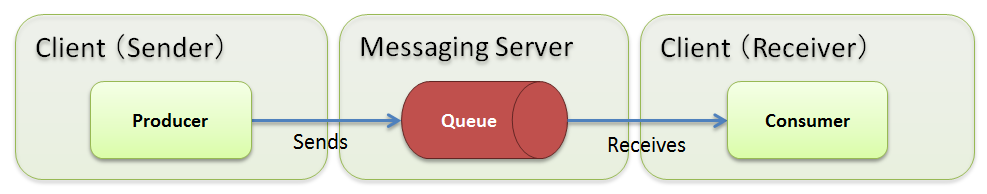 ProducerはQueueにメッセージを送信し、ConsumerはQueueからメッセージを取得し、処理を行う。