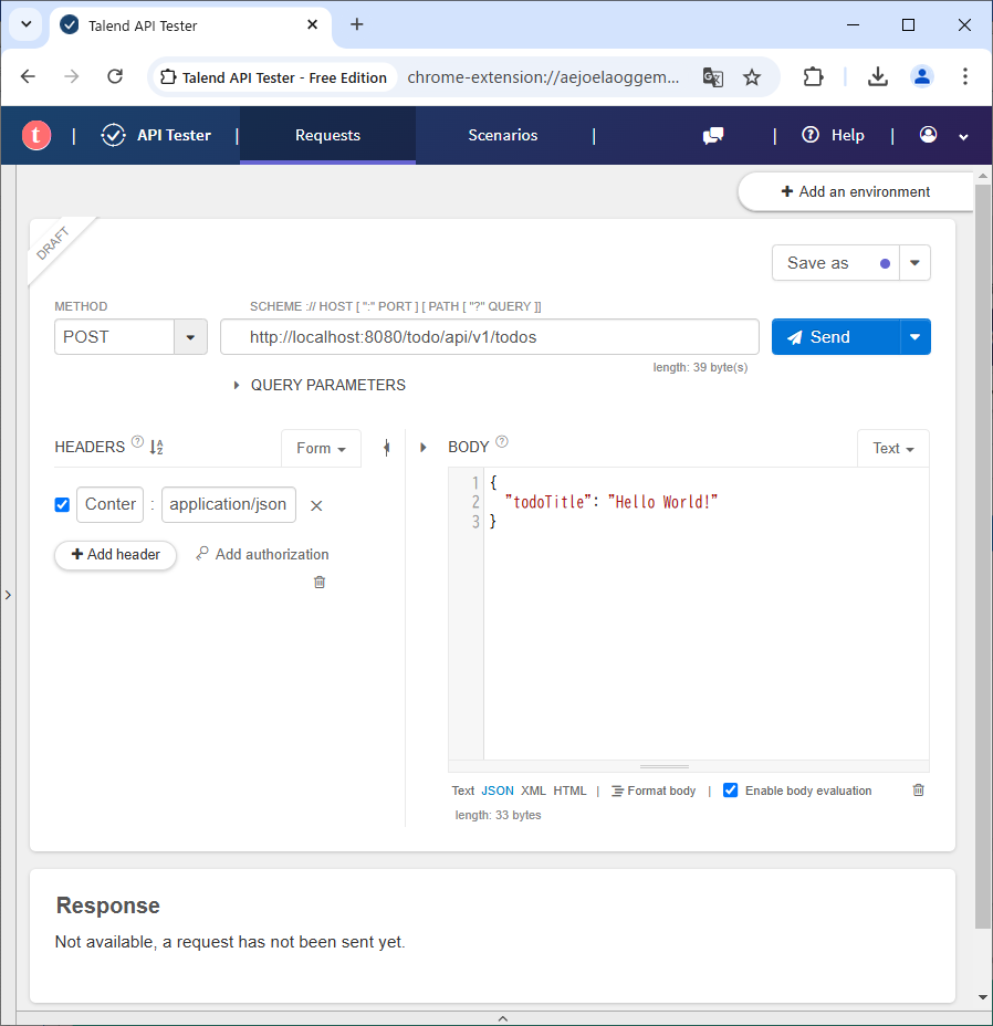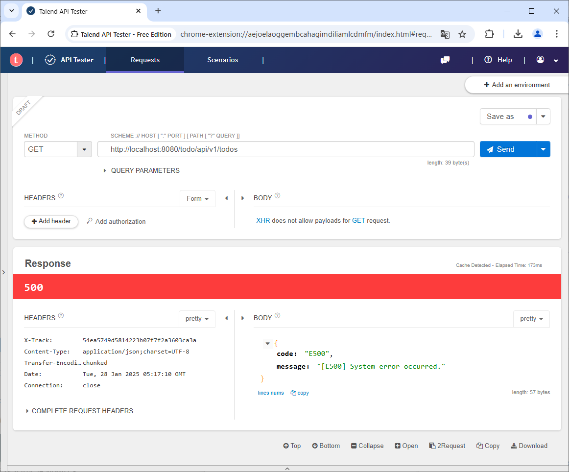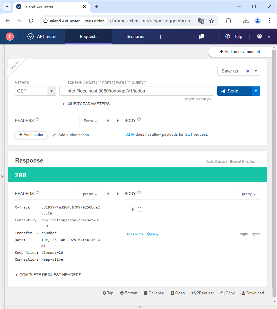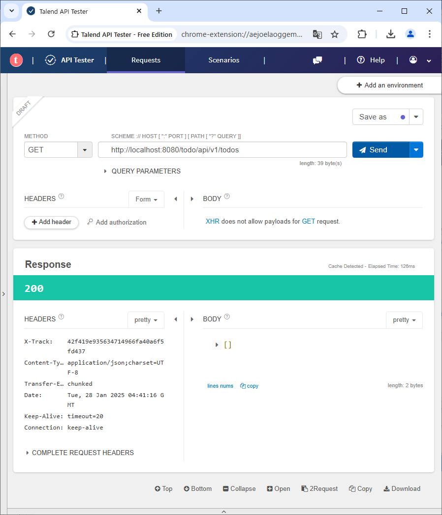 Talend API Testerを開いてURLにhttp://localhost:8080/todo/api/v1/todosを入力し、メソッドにGETを指定して、”Send”ボタンをクリックする。