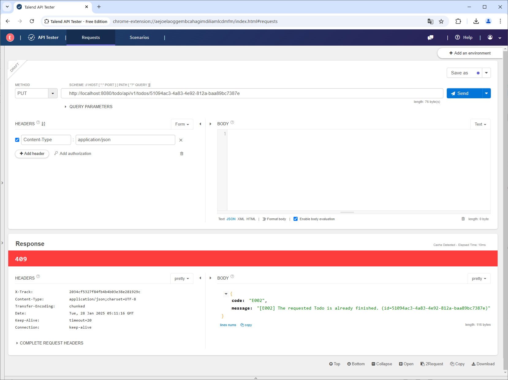 todoIdをコピーして貼り付けてから、”Send”ボタンを2回クリックする。todoIdを指定すること。2回目のリクエストに対するレスポンスとして、”409”のHTTPステータスが返却され、「RESPONSE」の「Body」には、エラー情報のJSONが表示される。