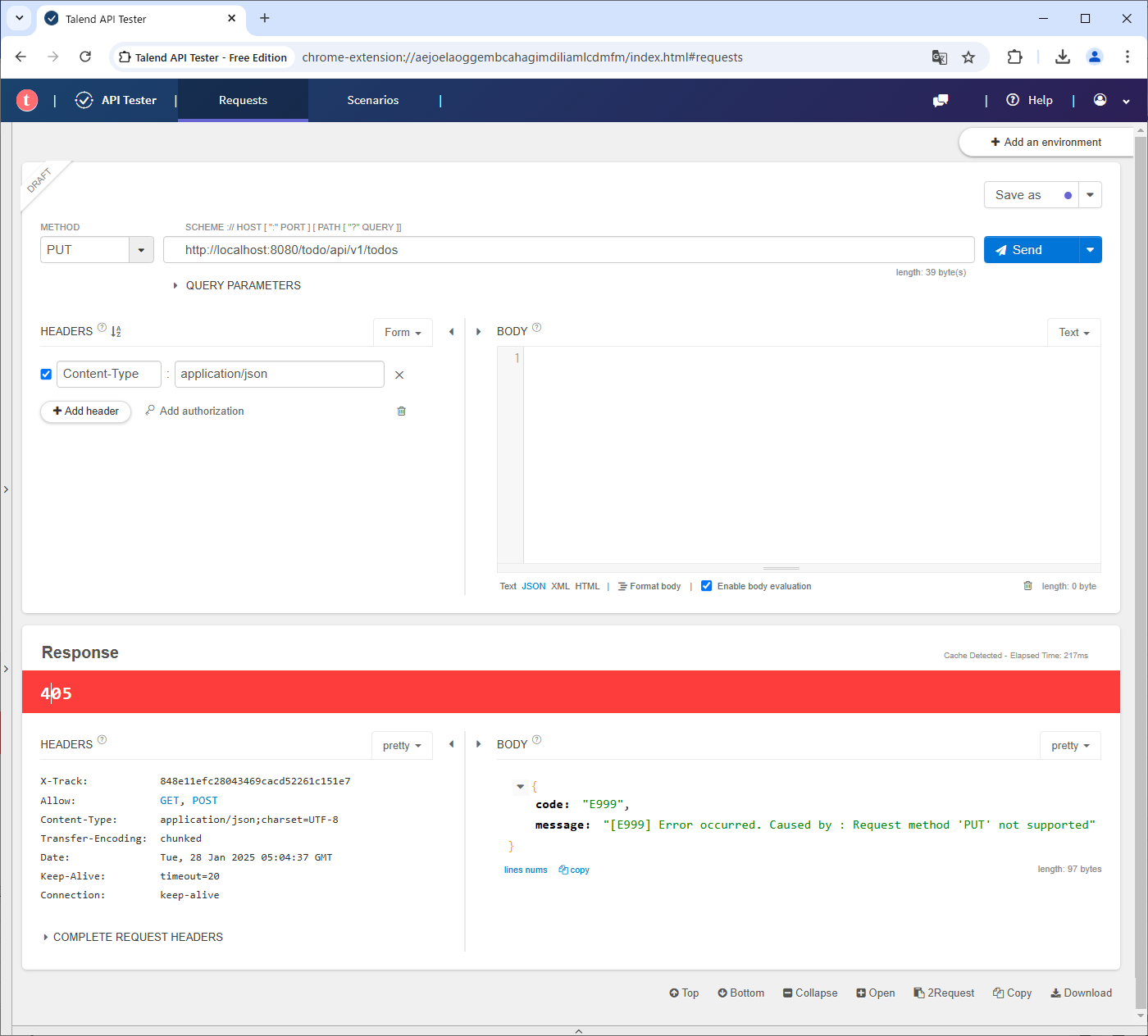 ResponseEntityExceptionHandlerでハンドリングされる例外については、HTTPレスポンスBODYにエラー情報が出力される。ResponseEntityExceptionHandlerでハンドリングされる例外については、ResponseEntityExceptionHandlerのJavaDocを参照されたい。“405”のHTTPステータスが返却され、「RESPONSE」の「Body」には、エラー情報のJSONが表示される。