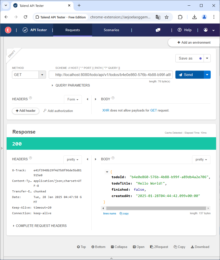 todoId」に、取得対象のTodoリソースのIDを指定する。todoId」に9aef3ee3-30d4-4a7c-be4a-bc184ca1d558を指定している。> GET /todo/api/v1/todos/9aef3ee3-30d4-4a7c-be4a-bc184ca1d558 HTTP/1.1