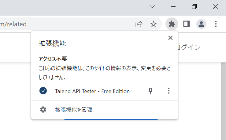 Chromeの右上の拡張機能のマークを押下して拡張機能一覧を開くと、Talend API Testerが追加されている。