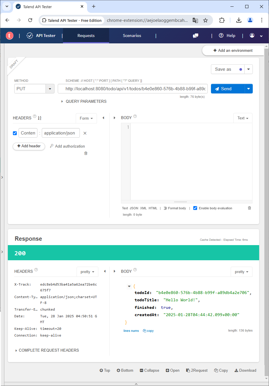 todoId」に、更新対象のTodoのIDを指定する。> PUT /todo/api/v1/todos/9aef3ee3-30d4-4a7c-be4a-bc184ca1d558 HTTP/1.1