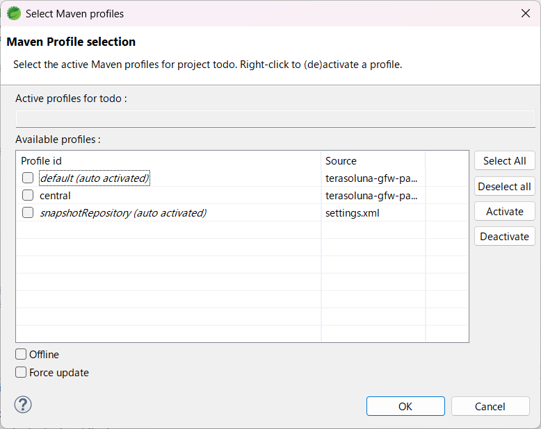 プロジェクトを右クリック > 「Maven」->「Select Maven Profiles…」をクリックし、設定するプロファイルを選択して「OK」ボタンを押下する。