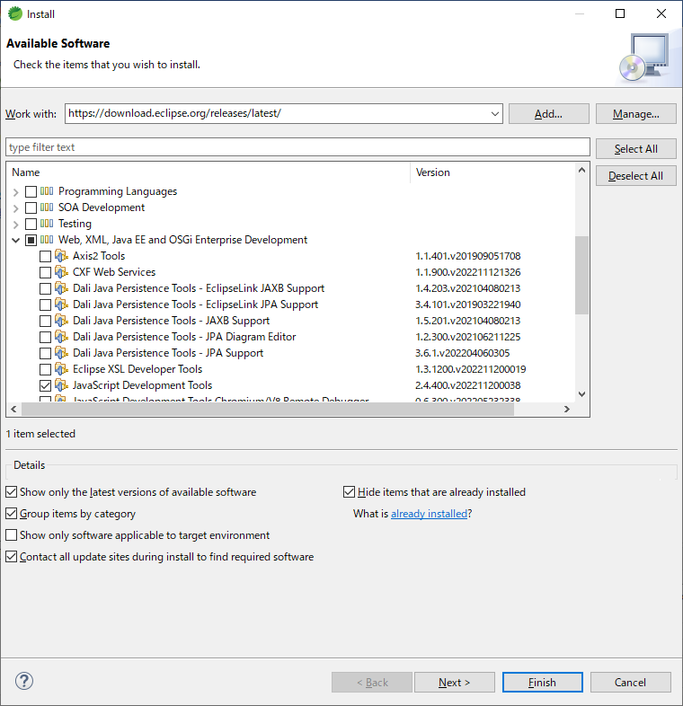 https://download.eclipse.org/releases/latest/」を入力する。Web,XML,Java EE and OSGi Enterprise Development > JavaScript Development Tools を選択し、インストールを行う。