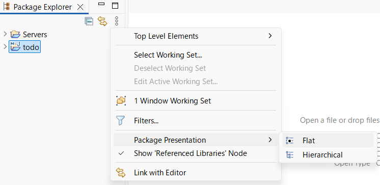 Package Explorerの「View Menu」 (右端の3点リーダー)をクリックし、「Package Presentation」->「Hierarchical」を選択する。