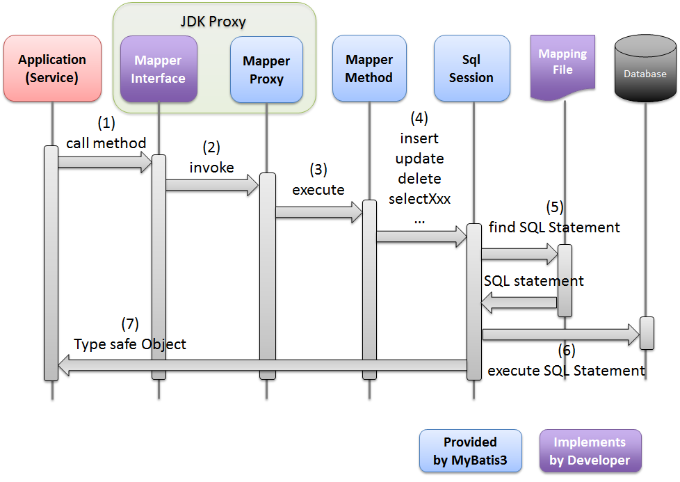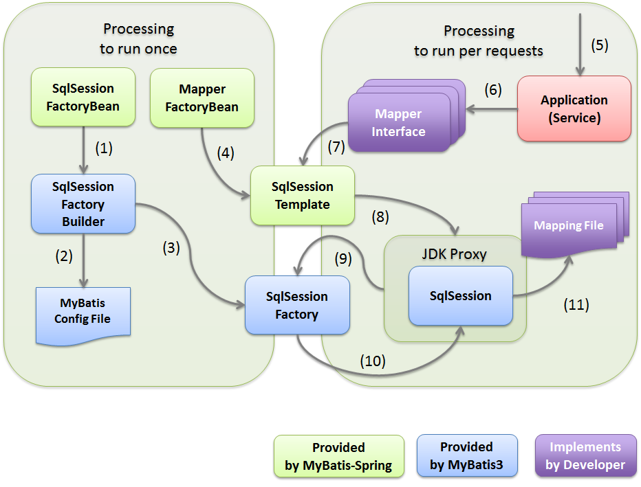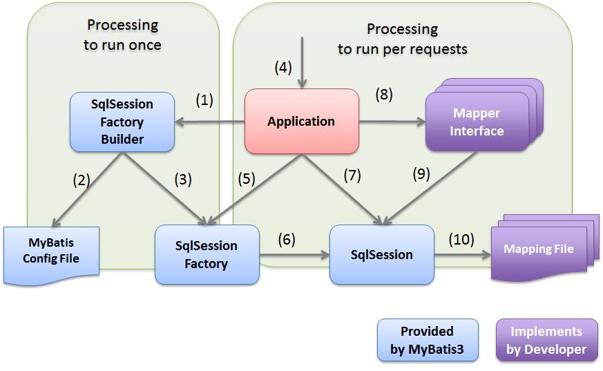 以下に、MyBatis-Springの主要コンポーネントが、どのような流れでデータベースにアクセスしているのかを説明する。 データベースにアクセスするための処理は、大きく2つにわける事ができる。