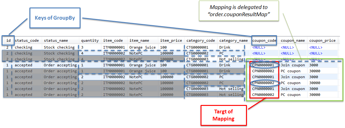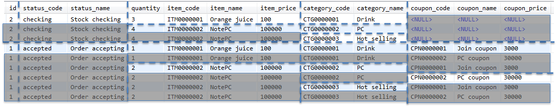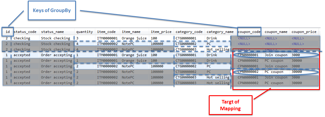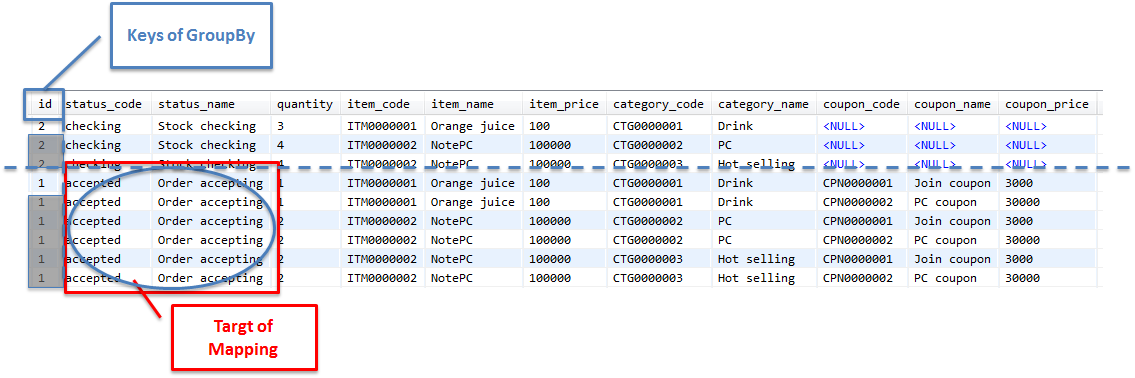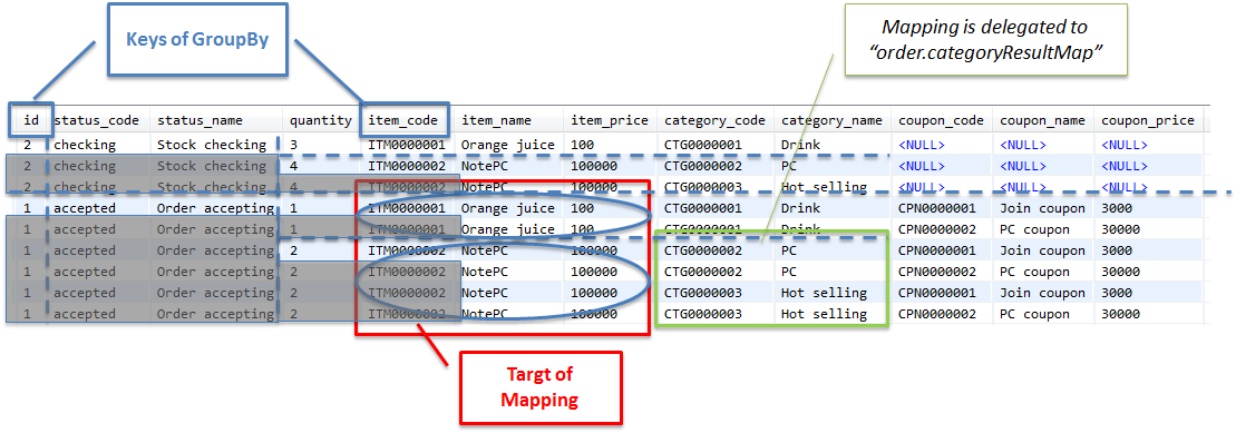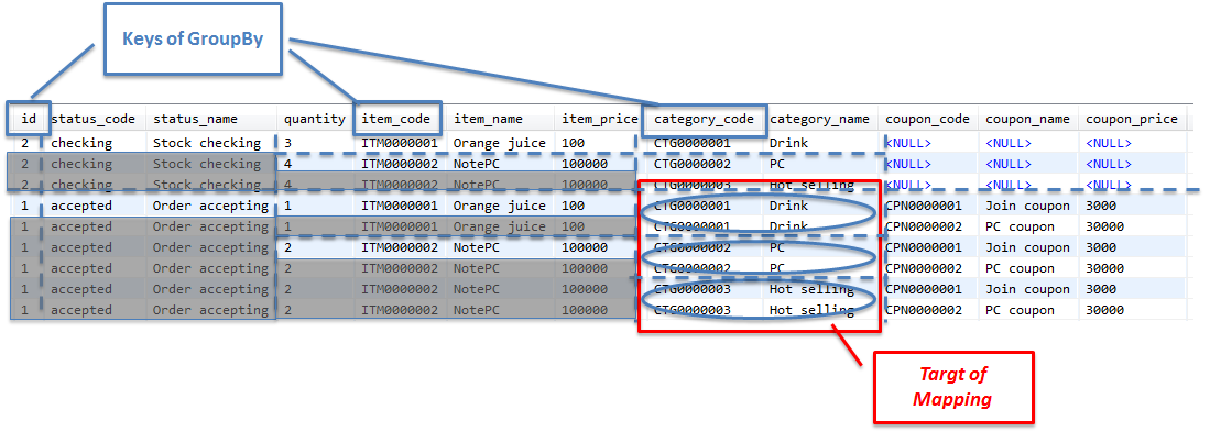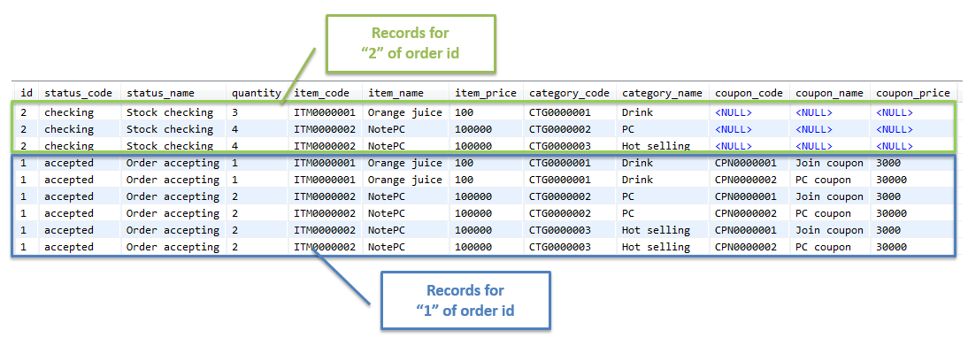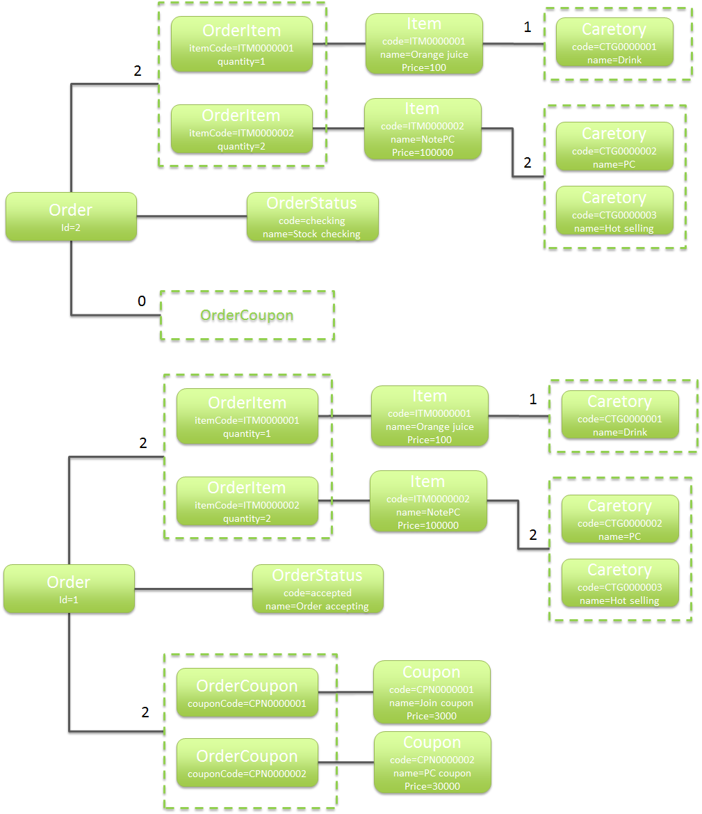 ここからは、ショッピングサイトで扱う注文データを、1回のSQLでまとめて取得し、主Entity及び関連Entityにマッピングする実装例について説明を行う。