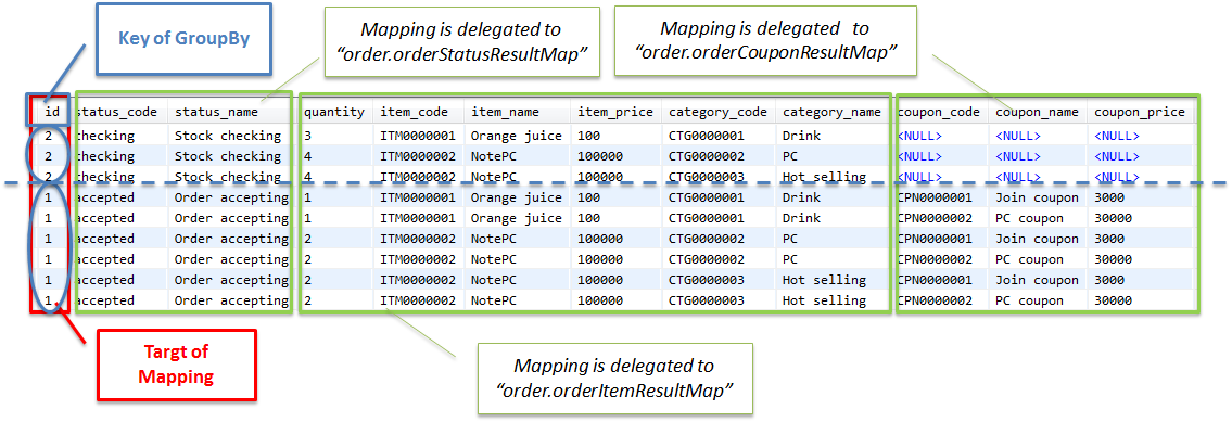 <resultMap id="itemResultMap" type="Item"> <id property="code" column="item_code"/> <result property="name" column="item_name"/> <result property="price" column="item_price"/> <!-- (1) --> <collection property="categories" column="item_code" select="findAllCategoryByItemCode" /> </resultMap> <select id="findAllCategoryByItemCode" parameterType="string" resultType="Category"> SELECT ct.code, ct.name FROM m_item_category ic INNER JOIN m_category ct ON ct.code = ic.category_code WHERE ic.item_code = #{itemCode} ORDER BY code </select>