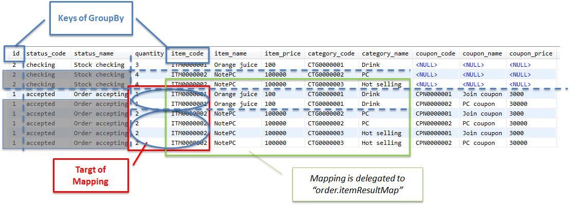 <resultMap id="itemResultMap" type="Item"> <id property="code" column="item_code"/> <result property="name" column="item_name"/> <result property="price" column="item_price"/> <collection property="categories" column="item_code" fetchType="lazy" select="findByItemCode" /> </resultMap>