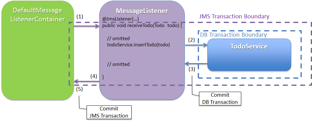 (1)JMSのトランザクションを開始する。(2)DBのトランザクションを開始する。(3)DBのトランザクションをコミットし、DBのトランザクションを終了する。(4)リスナーメソッドが正常終了する。(5)JMSのトランザクションをコミットし、JMSのトランザクションを終了する。業務ロジックで予期せぬ例外が発生した場合