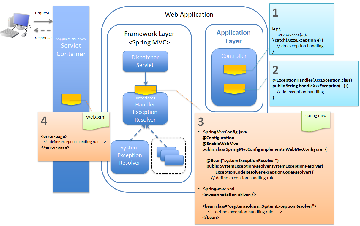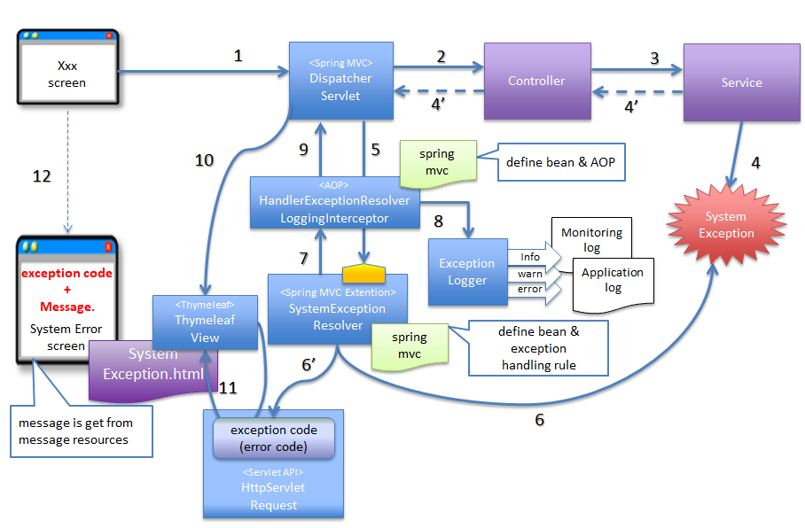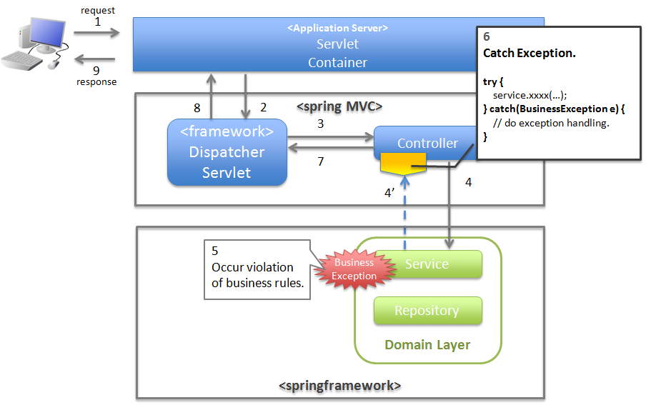 本節では、Spring MVC配下の処理で発生する例外のハンドリングについて説明する。説明対象は、以下の通りである。