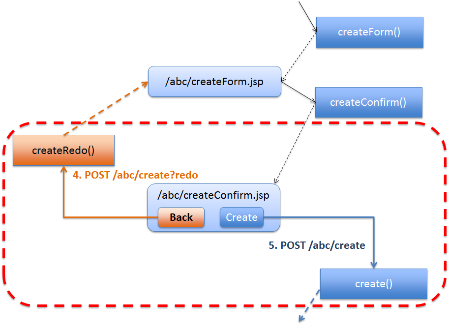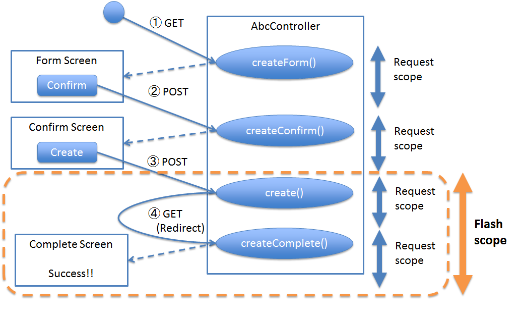 @RequestMapping(value = "xxx")をクラスレベルのアノテーションとして定義することを意味する。 - 処理内の画面フローで使用するリクエストのURLは、同じURLにする。同じURLとは