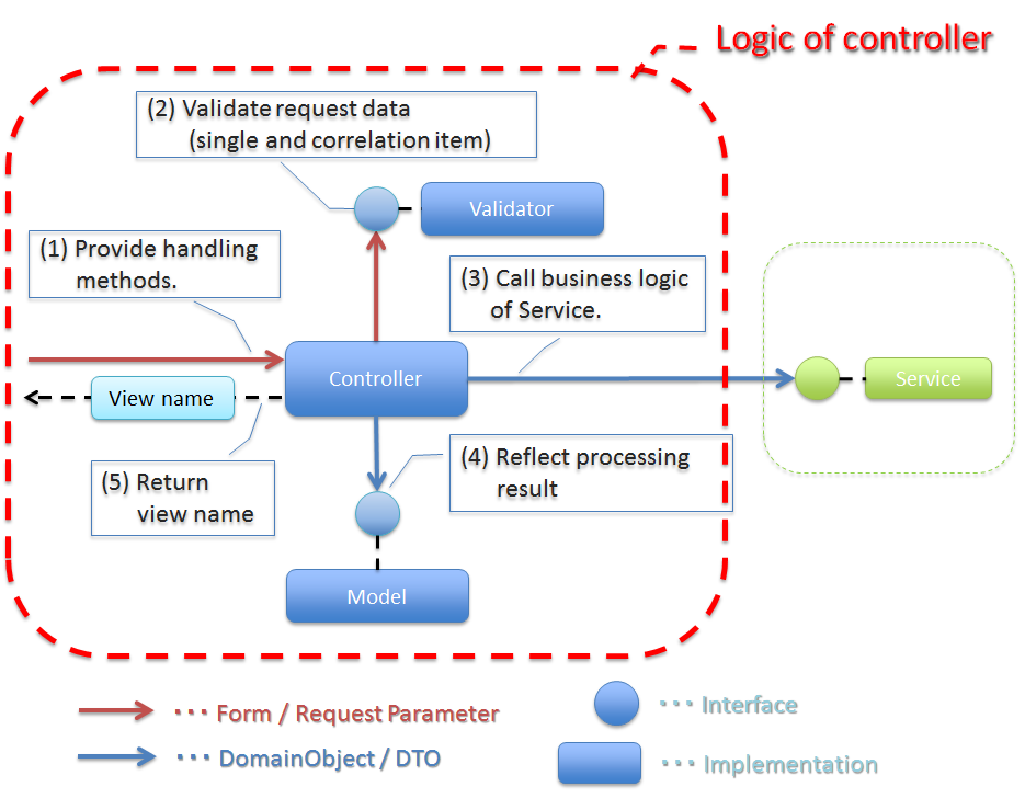 - Controllerは、リクエストの受付、業務処理の呼び出し、モデルの更新、Viewの決定といった処理を行い、リクエストを受けてからの一連の処理フローを制御する。アプリケーション層の実装において、もっとも重要な実装となる。
