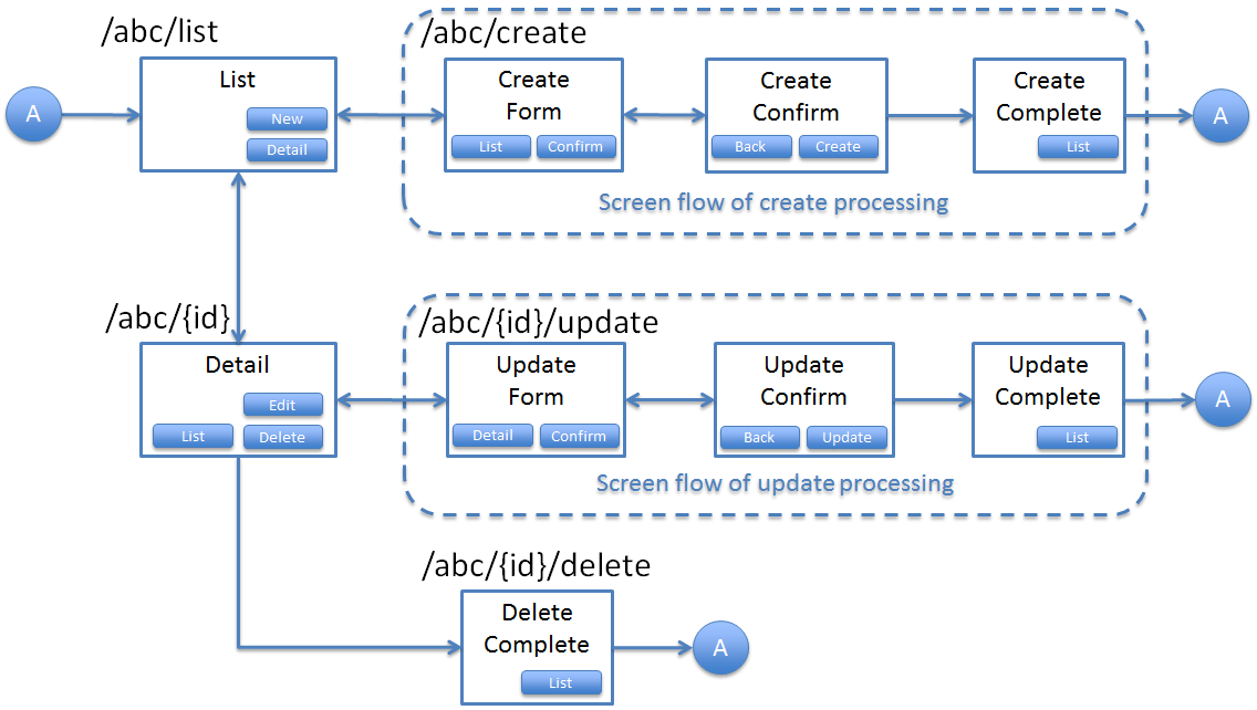 以下にベーシックな画面フローを行うサンプルアプリケーションを例にして、リクエストとハンドラメソッドの具体的なマッピング例を示す。