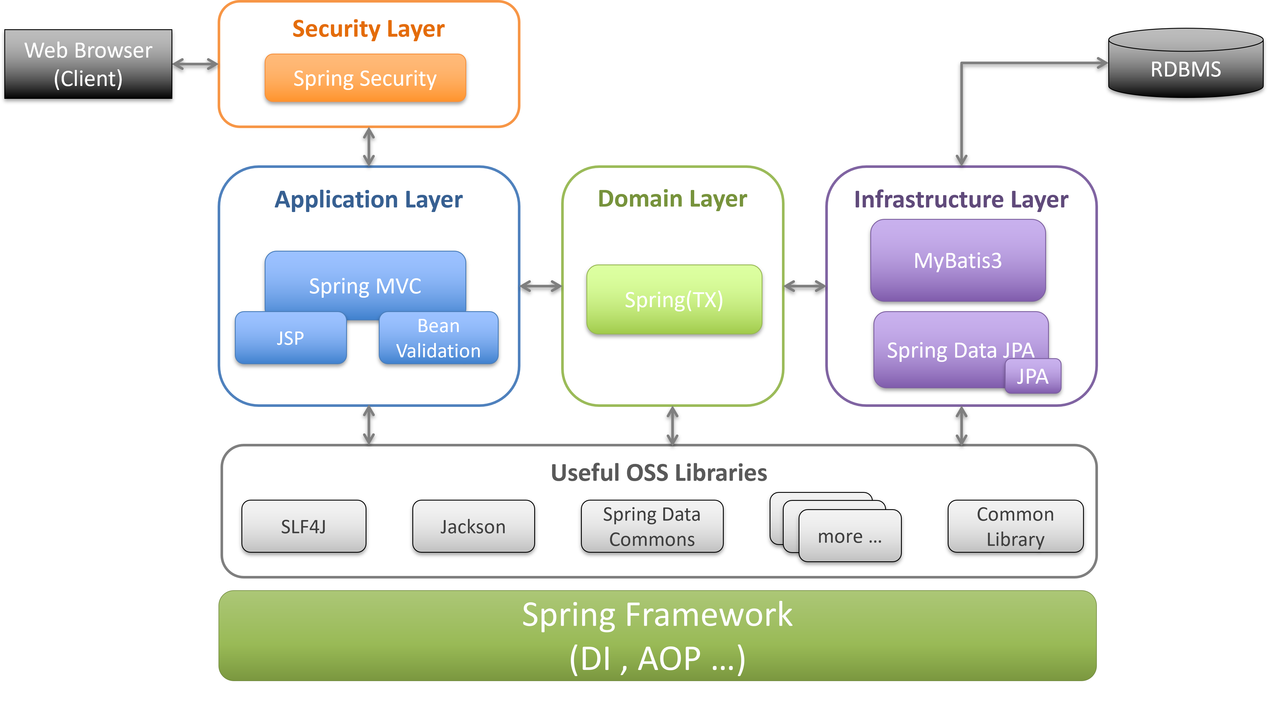 TERASOLUNA Server Framework for Java (5.x)で使用するSoftware Frameworkは独自のフレームワークではなく、Spring Frameworkを中心としたOSSの組み合わせである。