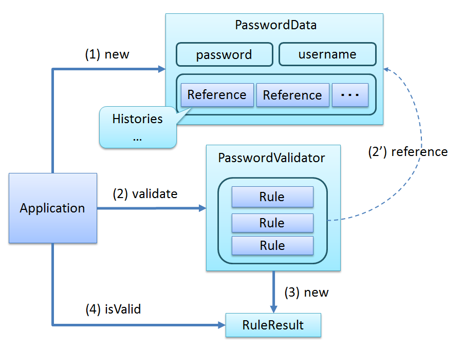 PasswordValidatorの validateメソッドに PasswordDataを引数として渡し、パスワード入力チェックを実行する。 |