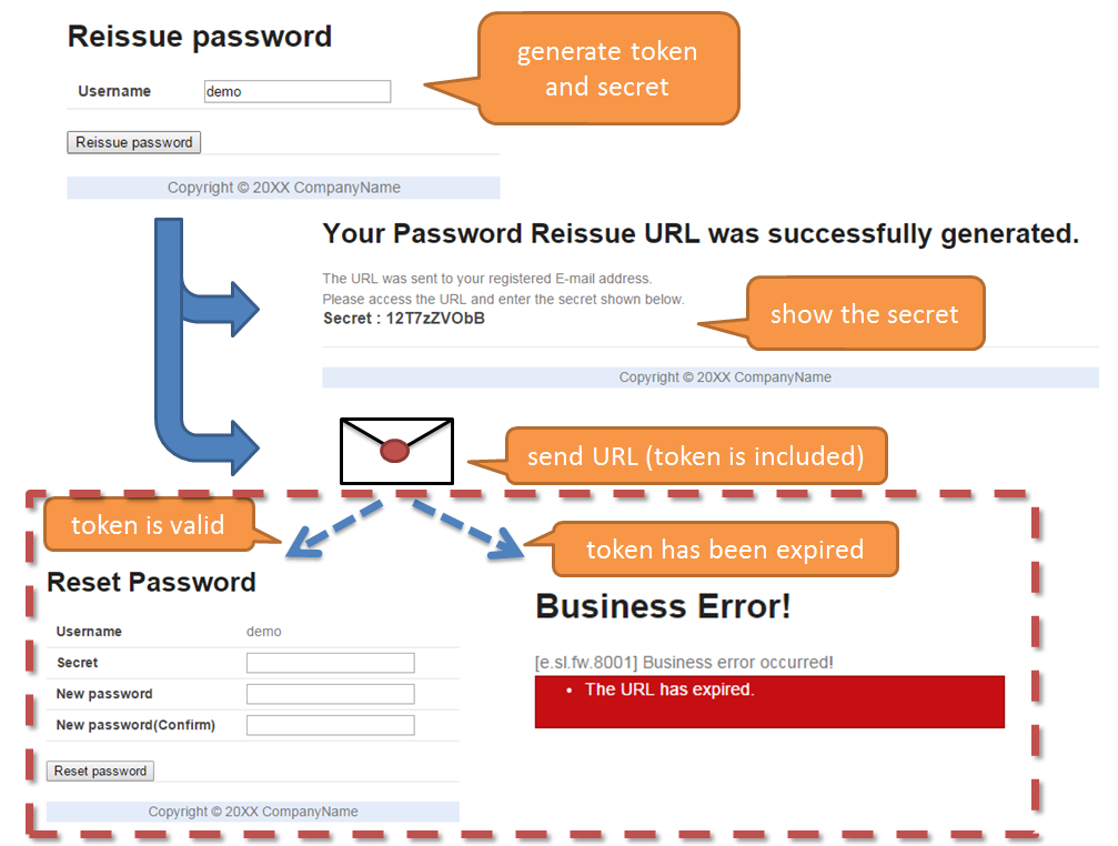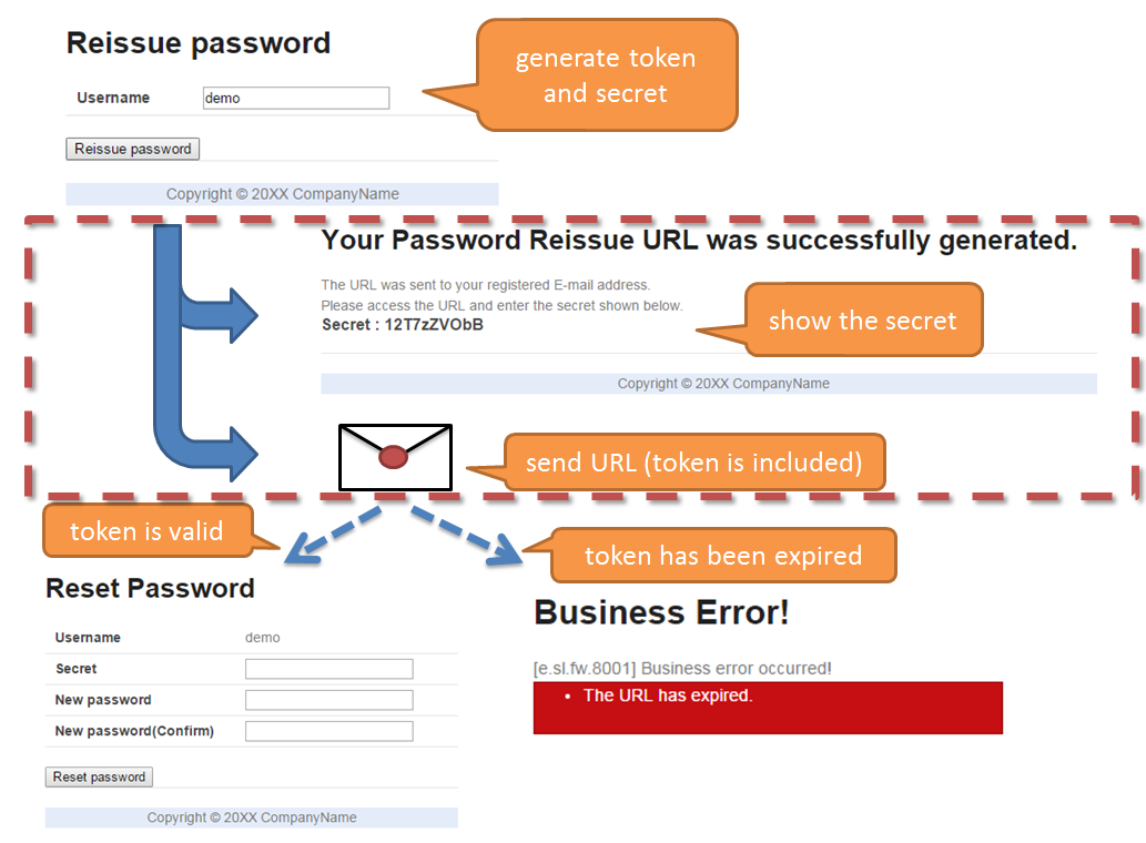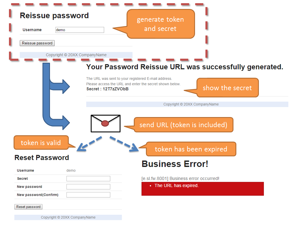 パスワード再発行画面のURLと秘密情報に有効期限を設定し、有効期限が切れた場合はパスワード再発行画面のURLと秘密情報を使用不能にする |