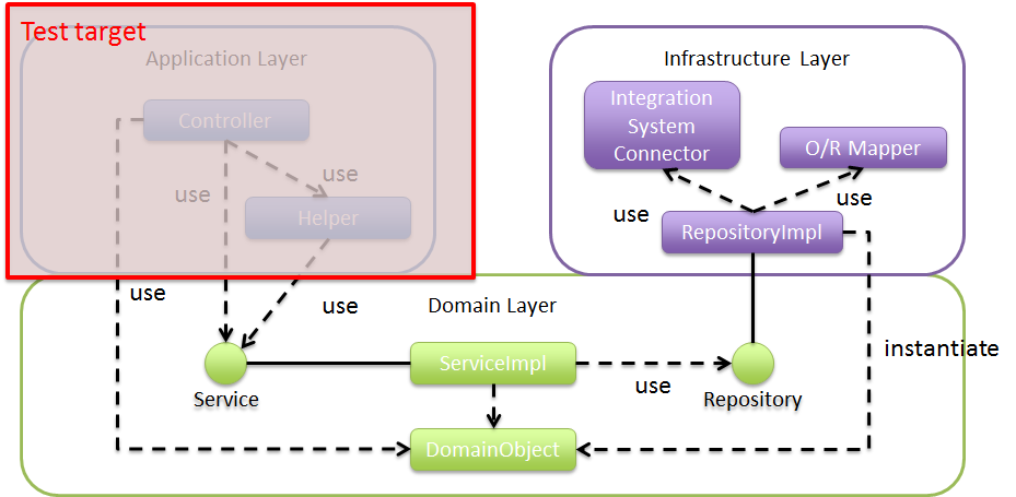 アプリケーションのレイヤ化では、Repositoryインターフェイスはドメイン層の成果物であるが、インフラストラクチャ層の単体テスト対象として紹介している。Serviceとのインターフェイスが正しいことは、ドメイン層の単体テストでも確認することを推奨する。