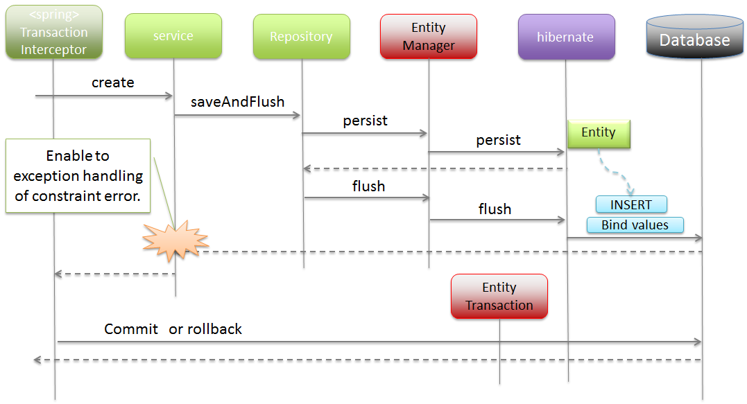 (1) Serviceから、Repositoryインタフェースのメソッドを呼び出す。メソッドの呼び出しパラメータとして、Entityオブジェクト、EntityのIDなどが渡される。上記例ではEntityを渡しているが、プリミティブな値となることもある。 (2) Repositoryインタフェースを動的に実装したProxyクラスは、org.springframework.data.jpa.repository.support.SimpleJpaRepositoryや、 カスタムRepositoryクラスに処理を委譲する。Serviceから指定されたパラメータが渡される。 (3) Repositoryの実装クラスは、JPAのAPIを呼び出す。Serviceから指定されたパラメータや、Repositoryの実装クラスで生成したパラメータなどが渡される。 (4) HibernateのJPA参照実装は、 HibernateのコアAPIの処理を呼び出す。Repositoryの実装クラスから指定されたパラメータやHibernateのJPA参照実装のクラスで生成したパラメータなどが渡される。 (5) HibernateのコアAPIは、指定されたパラメータからSQLとバインド値を生成しJDBCドライバに渡す。(実際の値のバインドは、java.sql.PreparedStatement のAPIが使われている) (6) JDBCドライバは、渡されたSQLとバインド値をデータベースに送信することで、SQLを実行する。