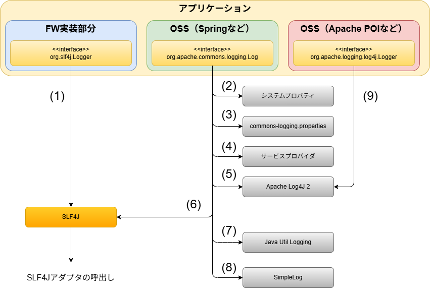 (2)~(8)のいずれも存在しない場合は、コンソールログを出力するSimpleLogを使用する。