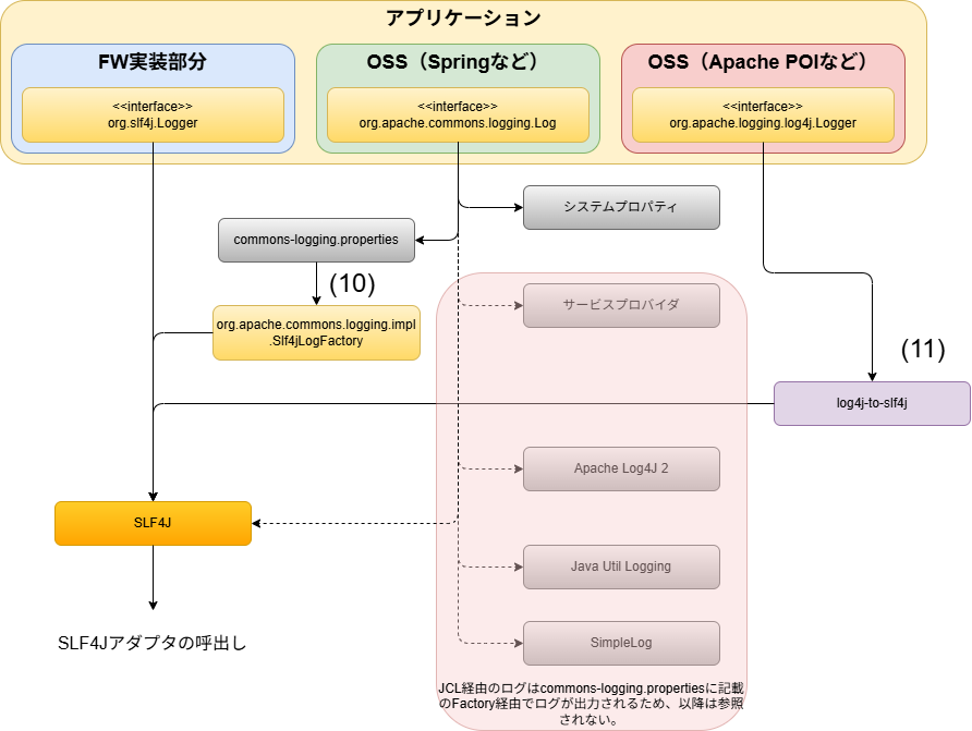 org.apache.commons.logging.LogFactory=org.apache.commons.logging.impl.Slf4jLogFactoryを設定することで、JCL経由のログをSLF4Jへブリッジする。当設定はブランクプロジェクトのデフォルト設定として追加してある。ブランクプロジェクトのデフォルト設定はシングルプロジェクトの構成/マルチプロジェクトの構成を参照されたい。