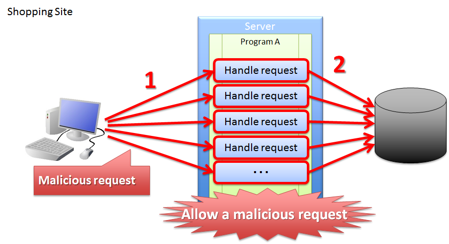 (1) 攻撃者が、正規の画面遷移を行わずに、直接商品の購入を行う処理に対してリクエストを実行する。 (2) サーバは、不正なルートでリクエストが行われていることを検知することができないため、リクエストで受けた商品の購入処理をDBに対して反映してしまう。不正なリクエストによって購入処理を実行することで、各サーバの負荷が高くなったり、正規のルートで商品が購入できなくなるなどの問題が発生してしまう。