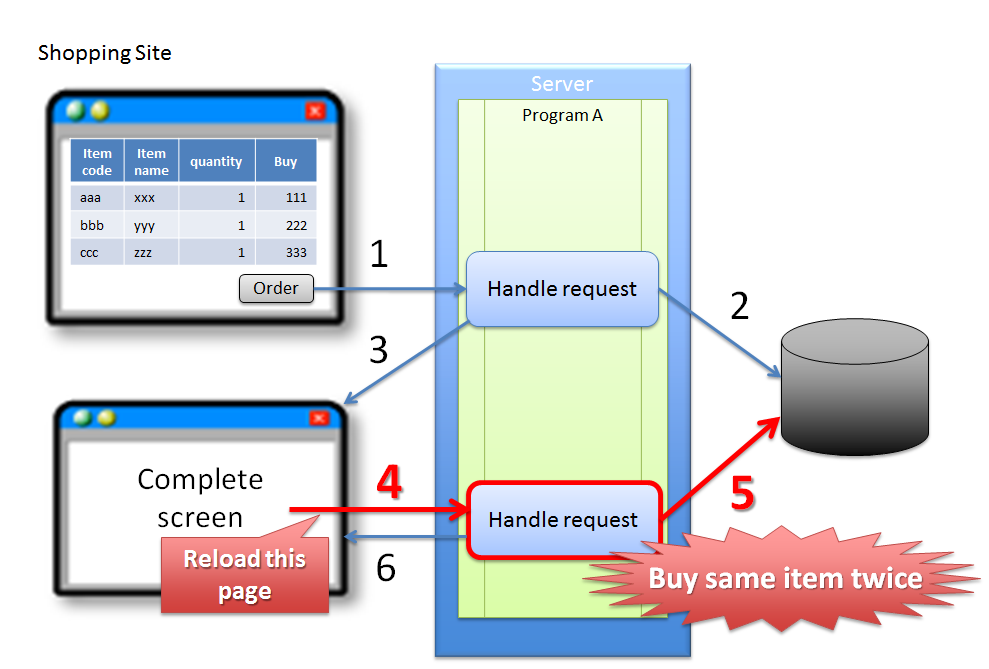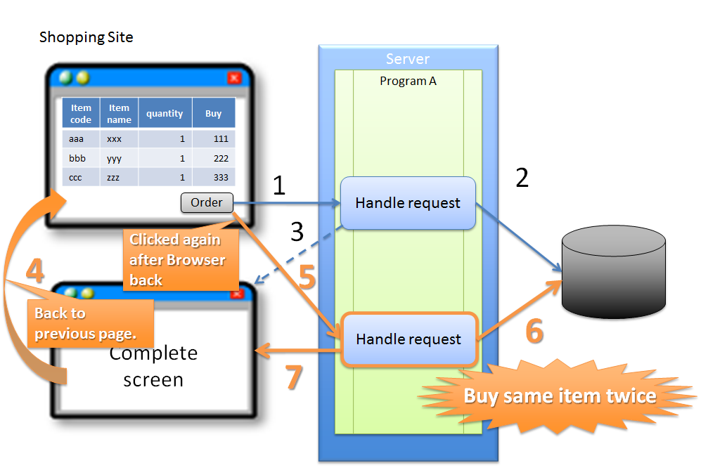 (1) 購買者が、商品購入画面で注文ボタンをクリックする。 (2) サーバは、(1)のリクエストで受けた商品の購入処理をDBに対して反映する。 (3) サーバは、(1)のリクエストで受けた商品の購入完了画面を応答する。 (4) 購買者が、ブラウザの戻るボタンを使って購入画面を再度表示する。 (5) 購買者が、ブラウザの戻るボタンを使って表示した購入画面で注文ボタンを再度クリックする。 (6) サーバは、(5)のリクエストで受けた商品の購入処理をDBに対して反映する。 (7) サーバは、(5)のリクエストで受けた商品の購入完了画面を応答する。Note