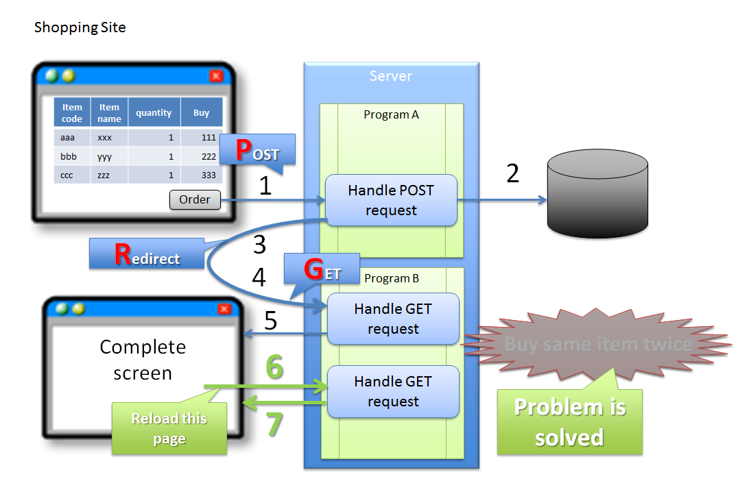 (1) 購買者が、商品購入画面で注文ボタンをクリックする。リクエストは、POSTメソッドを使って送信される。 (2) サーバは、(1)のリクエストで受けた商品の購入処理をDBに対して反映する。 (3) サーバは、商品の購入完了画面を表示するためのURLに対するリダイレクト応答を行う。 (4) ブラウザは、商品の購入完了画面を表示するためのURLにリクエストを送信する。リクエストは、GETメソッドを使って送信される。 (5) サーバは、商品の購入完了画面を応答する。 (6) 購買者が、誤ってブラウザのリロード機能を実行する。リロード機能によって要求されるリクエストは、商品の購入完了画面を表示するためのリクエストとなるため、更新処理が再実行されることはない。 (7) サーバは、商品の購入完了画面を応答する。Note
