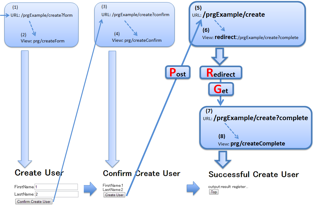 createConfirm.jsp<h1>Confirm Create User</h1> <div id="prgForm"> <form:form action="${pageContext.request.contextPath}/prgExample/create" method="post" modelAttribute="postRedirectGetForm"> FirstName:${f:h(postRedirectGetForm.firstName)}<br> <form:hidden path="firstName" /> LastName:${f:h(postRedirectGetForm.lastName)}<br> <form:hidden path="lastName" /> <form:button>Create User</form:button> <%-- (6) --%> </form:form> </div>