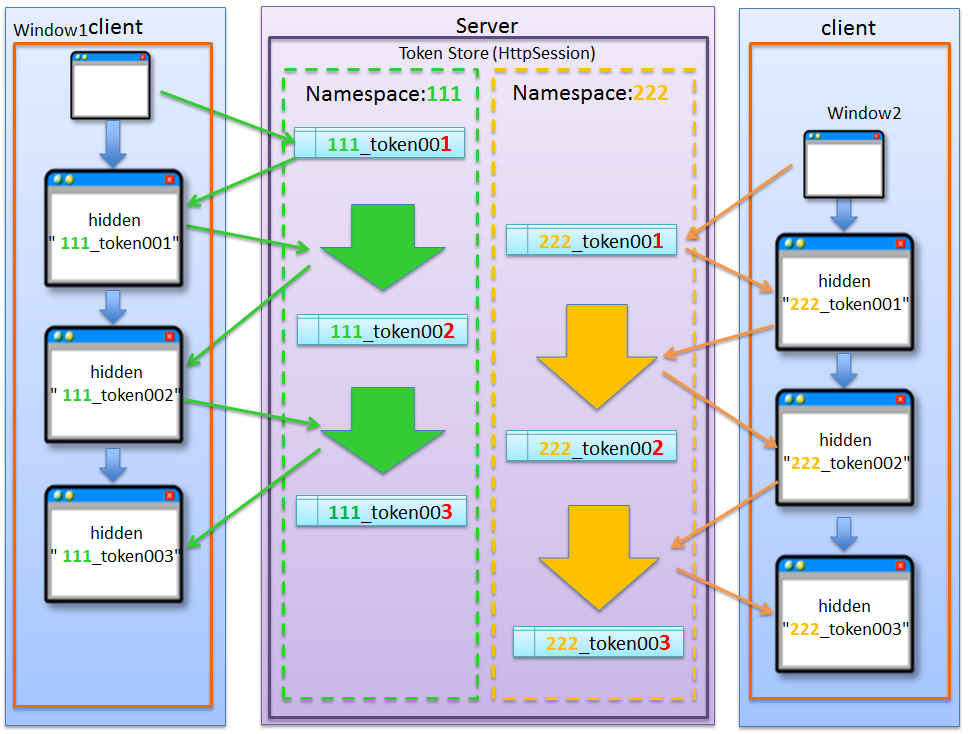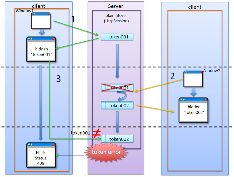 (1) Window1からリクエストを送信し、応答されたトランザクショントークン(token001)をブラウザに保持する。サーバ上で保持しているトランザクショントークンはtoken001となる。 (2) Window2からリクエストを送信し、応答されたトランザクショントークン(token002)をブラウザに保持する。サーバ上で保持しているトランザクショントークンはtoken002となる。このタイミングで(1)の処理で生成されたトランザクショントークン(token001)は破棄される。 (3) Window1からブラウザで保持しているトランザクショントークン(token001)を含めてリクエストを送信する。サーバ上で保持しているトランザクショントークン(token002)と、リクエストで送信されたトランザクショントークン(token002)が一致しないため、不正なリクエストと判断され、トランザクショントークンエラーとなる。Warning