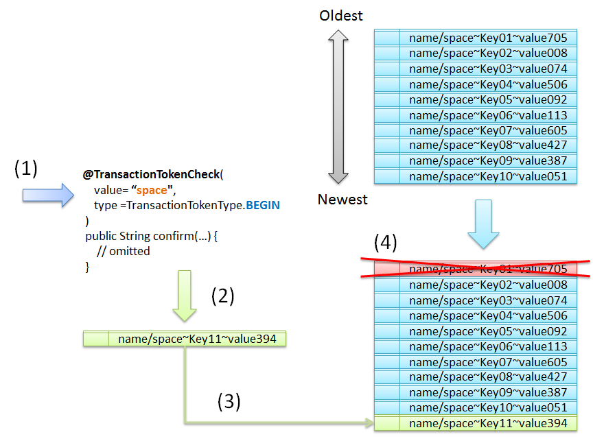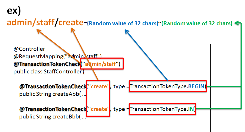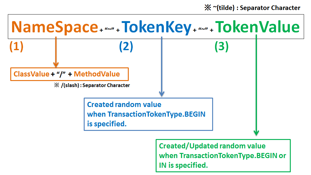 transactionTokenCheckExample(橙色の下線)がNameSpaceとなる。 - TokenKeyは、トランザクション開始時に払い出された値が引き回されて設定される。上記例だと、