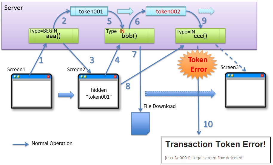 (1) クライアントから、リクエストを送信する。 (2) サーバは、トークン(token001)を作成し、サーバ上で保持する。 (3) サーバは、作成したトークン(token001)を、クライアントに引き渡す。 (4) クライアントから、トークン(token001)を含めたファイルダウンロードのリクエストを送信する。 (5) サーバは、サーバ上で保持しているトークン(token001)と、クライアントから送信されたトークン(token001)が同一かチェックする。値が同一なので、正規のリクエストと判断される。 (6)TransactionTokenTypeにINを設定しているため、サーバは、次のリクエストで使用するトークン(token002)を生成し、サーバ上で管理している値を更新する。この時点で、トークン(token001)は破棄される。 (7) サーバは、要求のあったファイルを返却する。更新されたトークンをクライアントに返却しないため、この時点で画面のトークン(token001)とサーバのトークン(token002)が不一致となる (8) クライアントから、トークン(token001)を含めたリクエストを送信する。 (9) サーバは、サーバ上で保持しているトークン(token001)と、クライアントから送信されたトークン(token002)が同一かチェックする。値が不一致なので、不正なリクエストと判断される。