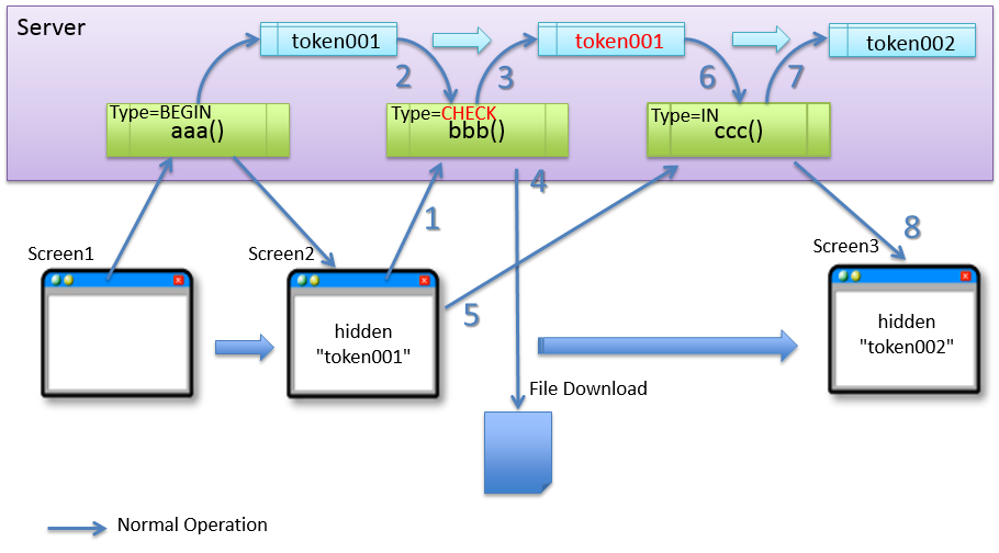 (1) クライアントから、トークン(token001)を含めたファイルダウンロードのリクエストを送信する。 (2) サーバは、サーバ上で保持しているトークン(token001)と、クライアントから送信されたトークン(token001)が同一かチェックする。値が同一なので、正規のリクエストと判断される。 (3)TransactionTokenTypeにCHECKを設定しているため、サーバ上で管理しているトークンを更新しない。 (4) サーバは、要求のあったファイルを返却する。 (5) クライアントから、トークン(token001)を含めたリクエストを送信する。 (6) サーバは、サーバ上で保持しているトークン(token001)と、クライアントから送信されたトークン(token001)が同一かチェックする。値が同一なので、正規のリクエストと判断される。 (7) サーバは、次のリクエストで使用するトークン(token002)を生成し、サーバ上で管理している値を更新する。この時点で、トークン(token001)は破棄される。 (8) サーバは、更新したトークン(token002)を、クライアントに引き渡す。