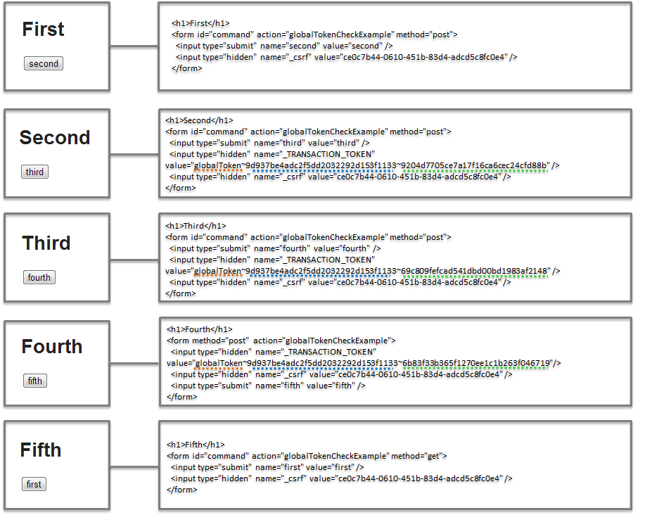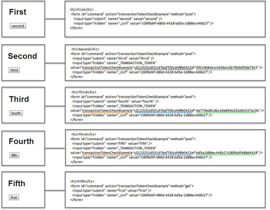 fourthView.html<h1>Fourth</h1> <form method="post" th:action="@{/transactionTokenCheckExample}"><!-- (1) --> <input type="submit" name="fifth" value="fifth"> </form>