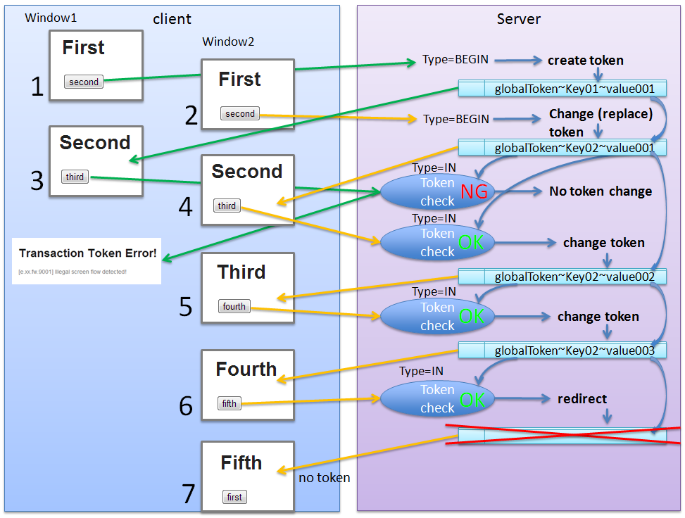 (1) window1の処理にて、TransactionTokenType.BEGINを行い、グローバルトークンを生成する。 (2) window2の処理にて、TransactionTokenType.BEGINでtokenを更新する。内部的に更新ではなく入れ替えとなるが、サーバ上保持できるトランザクショントークンは1つなので、トークンが更新されるイメージとなる。 (3) window1の処理のTransactionTokenType.INにて、tokenの値をチェックする。1の処理で生成したトランザクショントークンをリクエストパラメータとして送信するが、サーバ上に指定したトークンが存在しないため、トランザクショントークンエラーとなる。 (4) window2の処理のTransactionTokenType.INにて、tokenの値をチェックする。2の処理で生成したトランザクショントークンをリクエストパラメータとして送信し、サーバ上で保持しているトークン値と一致することをチェックする。一致している場合は、処理が継続される。 (5) (4)と同様。 (6) (4)と同様。 (7) リダイレクトを使用して画面を表示する場合は、トランザクショントークン用のhiddenタグは存在しない。Note