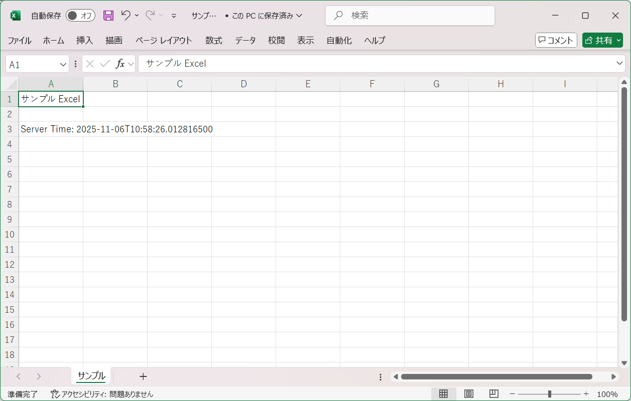 attachment; filename*=UTF-8''サンプル.xlsxを指定しているため、サンプル.xlsxというEXCELファイルがダウンロードされる。 |