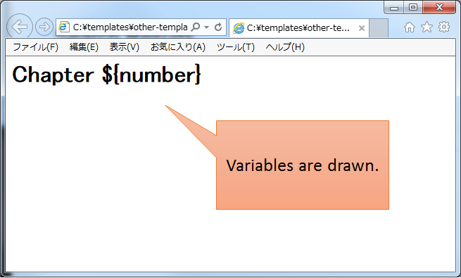 (1) <h1>要素にnumber変数を埋め込み、”Chapter “と連結した文字列をHTMLに出力する。実装は要素のコンテンツ部分に記述している。テンプレートファイルをブラウザで開いた場合には、テンプレートファイルのロジックが表示されてしまう。
