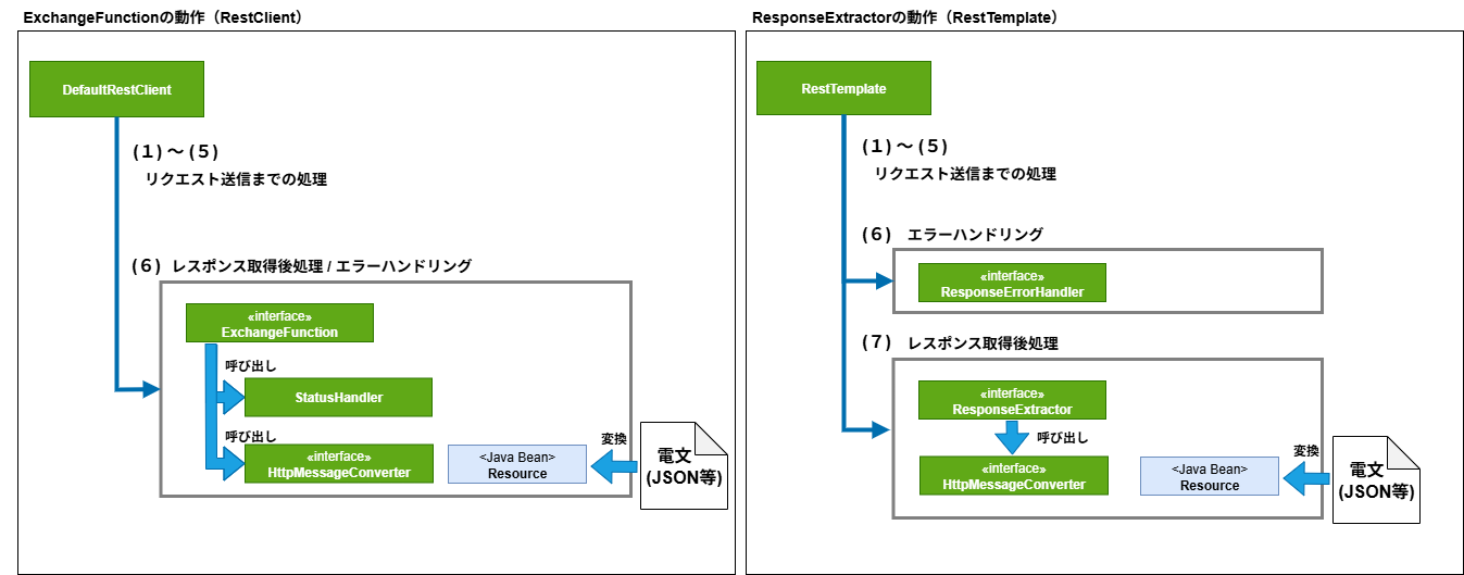 HttpMessageConverterの実装クラスを使用して、レスポンスボディに設定されている電文(JSON等)をJavaオブジェクトに変換する。なお、リクエスト送信前処理と同様で