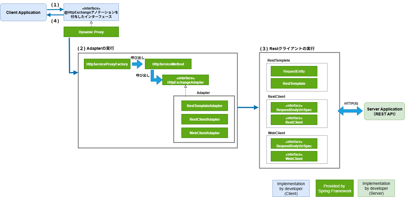 @HttpExchangeアノテーションを付与したインターフェースのメソッドを実行し、REST API(Web API)の呼び出し依頼を行う。なお、インターフェースの実装はSpring Frameworkが生成した動的プロキシが使用される。